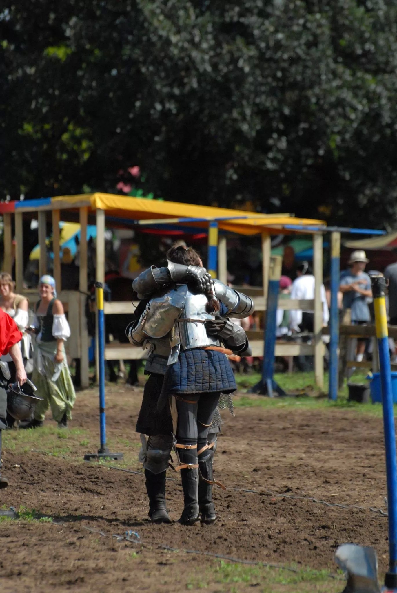 I raised my lance to Dave and once again Indy and I rode forth. I remember trying to focus on putting my weight forward and ridding through the hit, because this time Dave was aiming to hit. And hit he did. Before I could even get my lance aimed, Dave slammed into me, connecting right in the middle of my guard. I was twisted backwards and remember thinking for a mere moment, “I can save this…”, and then I slid off Indy and thudded into the dirt. Oops. I tasted blood and knew I had bitten my tongue, but nothing else was hurting. I turtled around on the ground for a bit before getting up, and then I see Dave walking down the lyst towards me with a big smile on his face. After making sure I was ok, I gave him a big hug and he told me, “you did good”.